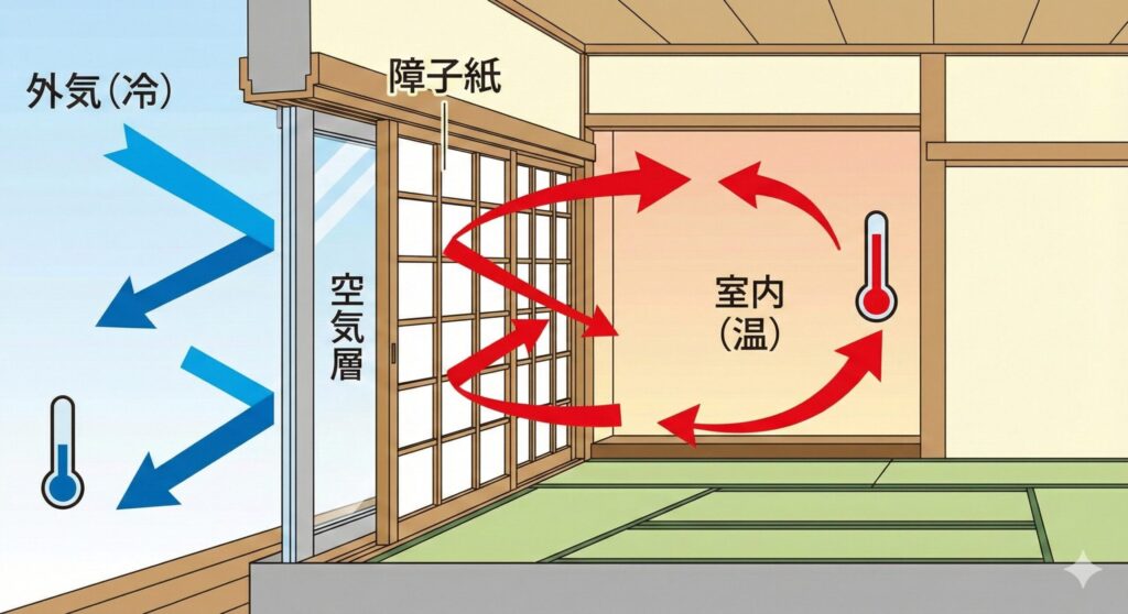 ① 驚異的な「断熱・保温効果」 実は、障子の断熱性はカーテンよりも優れているというデータがあります。 障子は、木枠と紙で構成されています。この「紙」と、窓ガラスとの間に生まれる「空気の層」が、天然の断熱材となります。