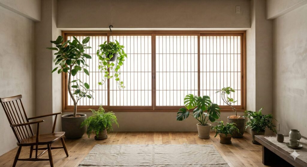 この2つは相性が抜群なのです。 白木(明るい色の木)の障子枠と、白い障子紙。この組み合わせは、北欧インテリアの基本である「ホワイト×ウッド」そのもの。 つまり、障子は無理に隠すものではなく、あえて見せることで「今っぽい洋室」が作れるアイテムなのです。