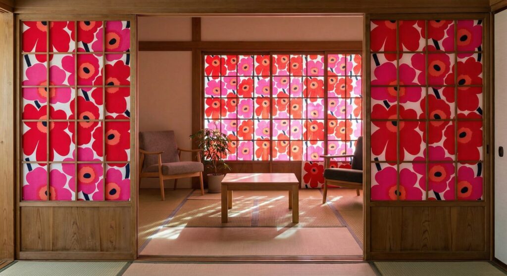 - 北欧柄の輸入壁紙を使う: マリメッコのような大胆な花柄や、幾何学模様の壁紙を障子の桟(枠)に合わせて貼ります。部屋のアクセントクロスのような役割を果たし、一気にアートな空間になります。